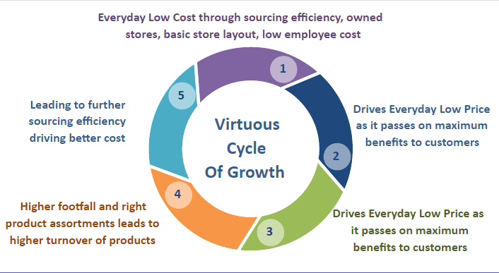 D-Mart’s winning formula in value retailing is the combination of rich product assortment and making it available at Everyday Low Price (EDLP). Everyday Low Price (EDLP) is a pricing strategy, promising customers a low price without the need to sale price events or comparison shopping. EDLP saves retail stores the effort and expense needed to markdown prices in store during sale events, and is also believed to generate shopper loyalty. The price set by an EDLP retailer is typically within the range of a high-low retailer’s discounted price and its non-discounted price. This strategy adopted by D-Mart is based on offering low prices on an everyday basis by achieving low procurement and operations cost rather than as special promotion limited to certain products or to a particular day, week or any other specific period in the year. The credit cycle of D-Mart, i.e., the time in which it returns the payment to the manufacturers for the goods purchased from them is quite less than other retail operators. This allows the company to avail massive cash discounts from the manufacturers, thereby cutting the purchase price of the goods.
