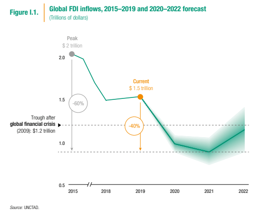 The COVID-19 crisis is projected to trigger a drastic fall in foreign direct investment (FDI) with an immediate adverse effect in 2020 and more worsening in 2021. Global FDI flows are expected to fall by up to 40% in 2020 from USD 1.54 trillion in 2019. This would bring FDI below USD 1 trillion for the first time since 2005. FDI is projected to decrease by a further 5 to 10% in 2021.
